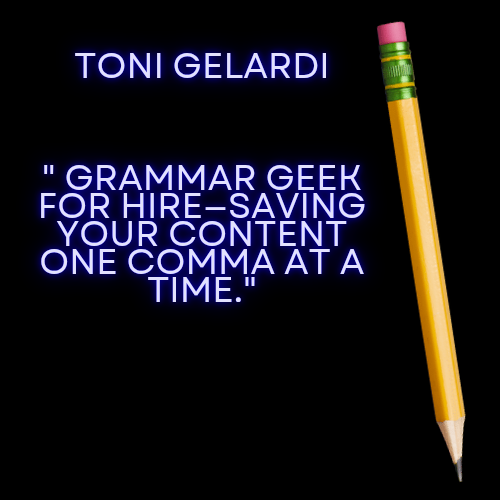 Mission statement: “As a professional editor and proofreader, I am committed to providing precise, clear, and objective revisions. I approach every project with fairness and neutrality, ensuring that the author’s voice remains authentic while enhancing clarity, coherence, and accuracy. My work is guided by professional standards, not personal bias, to deliver high-quality, polished content for every client.” Toni Gelardi